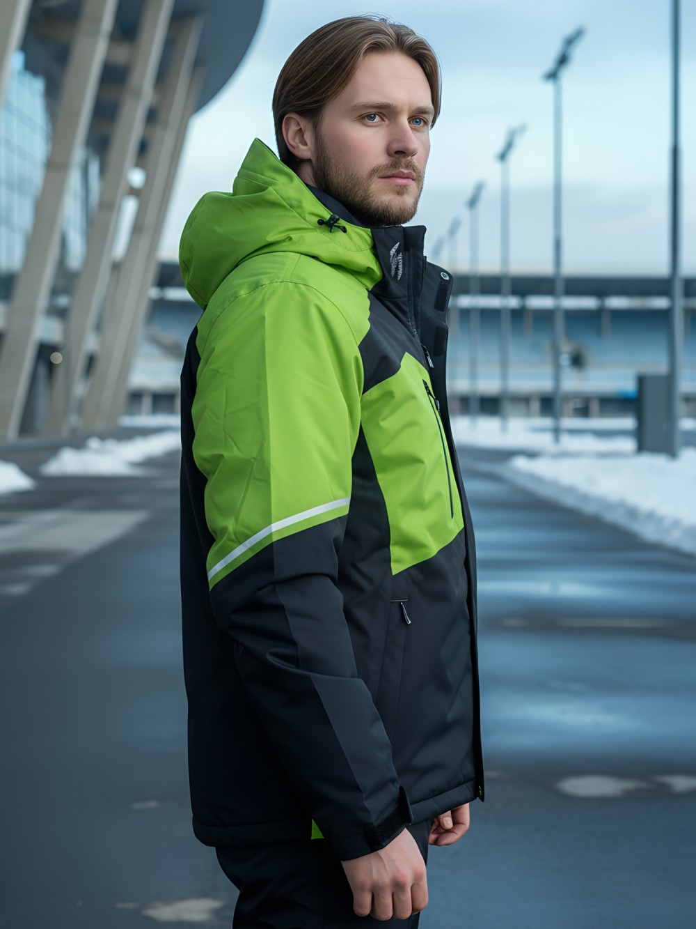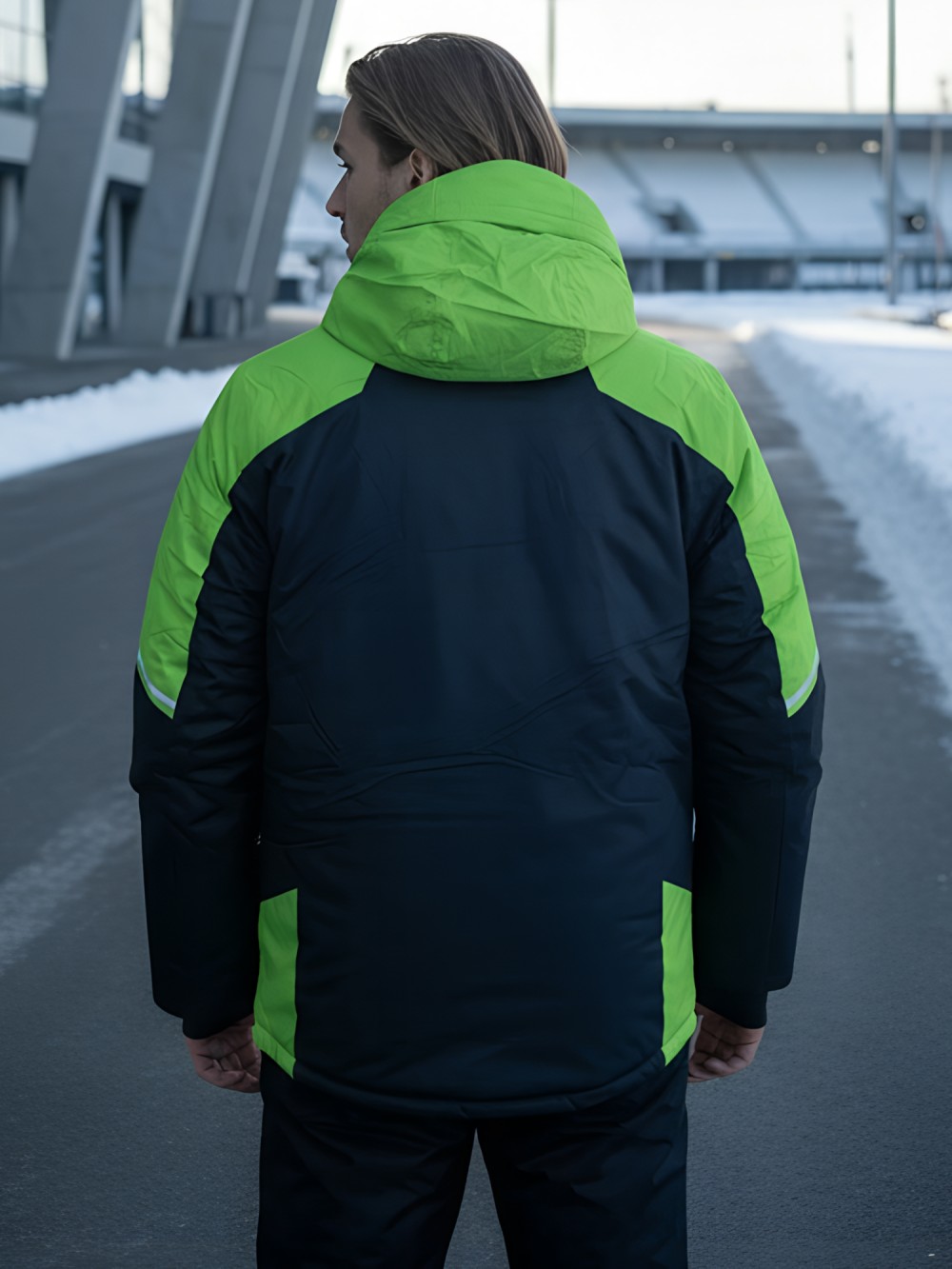 Утеплитель из синтепона (580-680 гр) и флисовая подкладка обеспечивают тепло и комфорт, а съемный капюшон и регулируемые бретели дают максимальную свободу движений. Стильные детали, такие как декоративные элементы и яркие цветовые решения (зеленый и желтый), выделят вас на склоне.