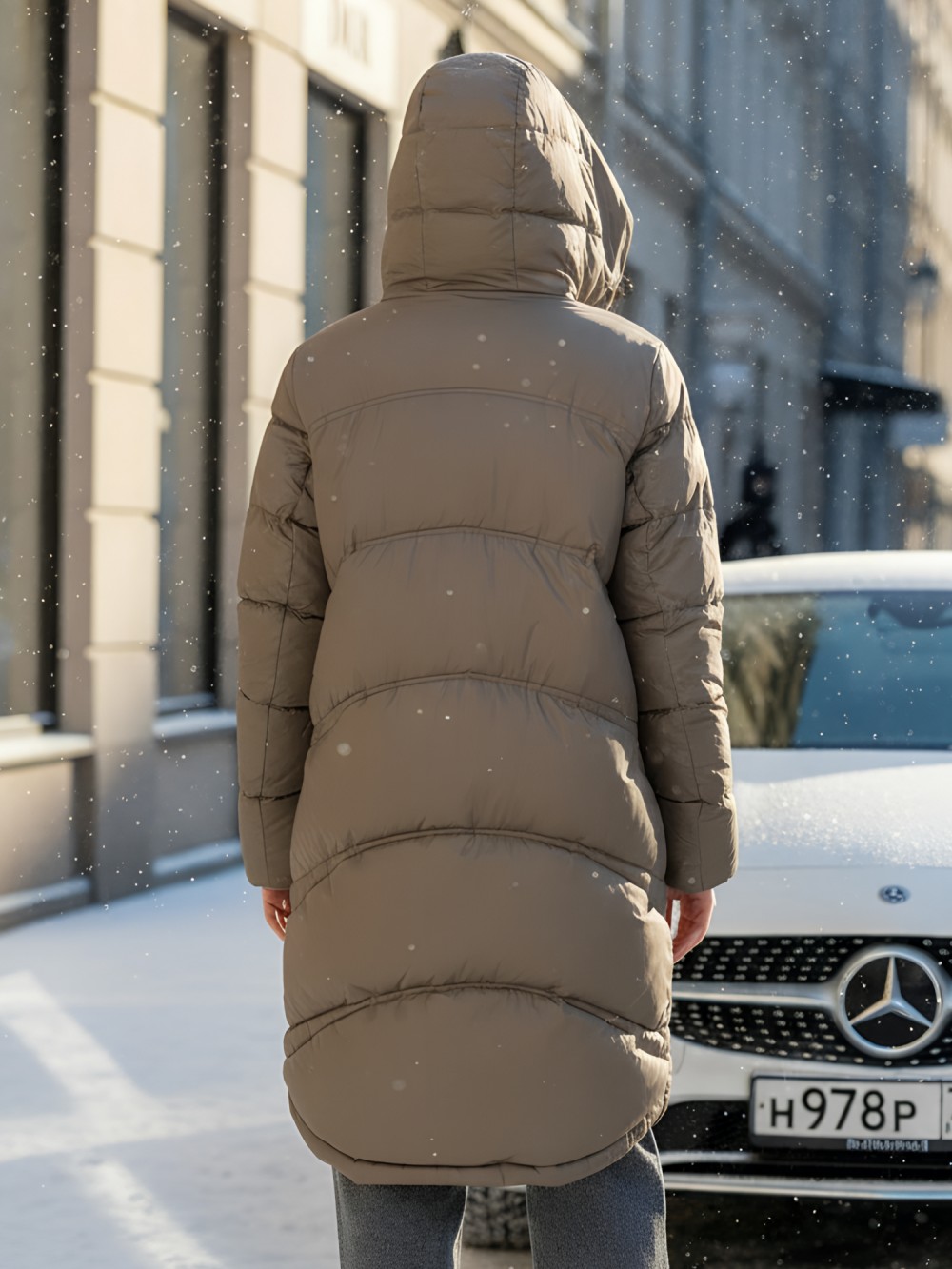С стильным стоячим воротником и удлиненной длиной до колен, это пальто сочетает в себе элегантный и офисный стиль, а также подходит для повседневной носки. Не съемный капюшон и фиксирующие элементы по низу обеспечивают дополнительную защиту от непогоды.