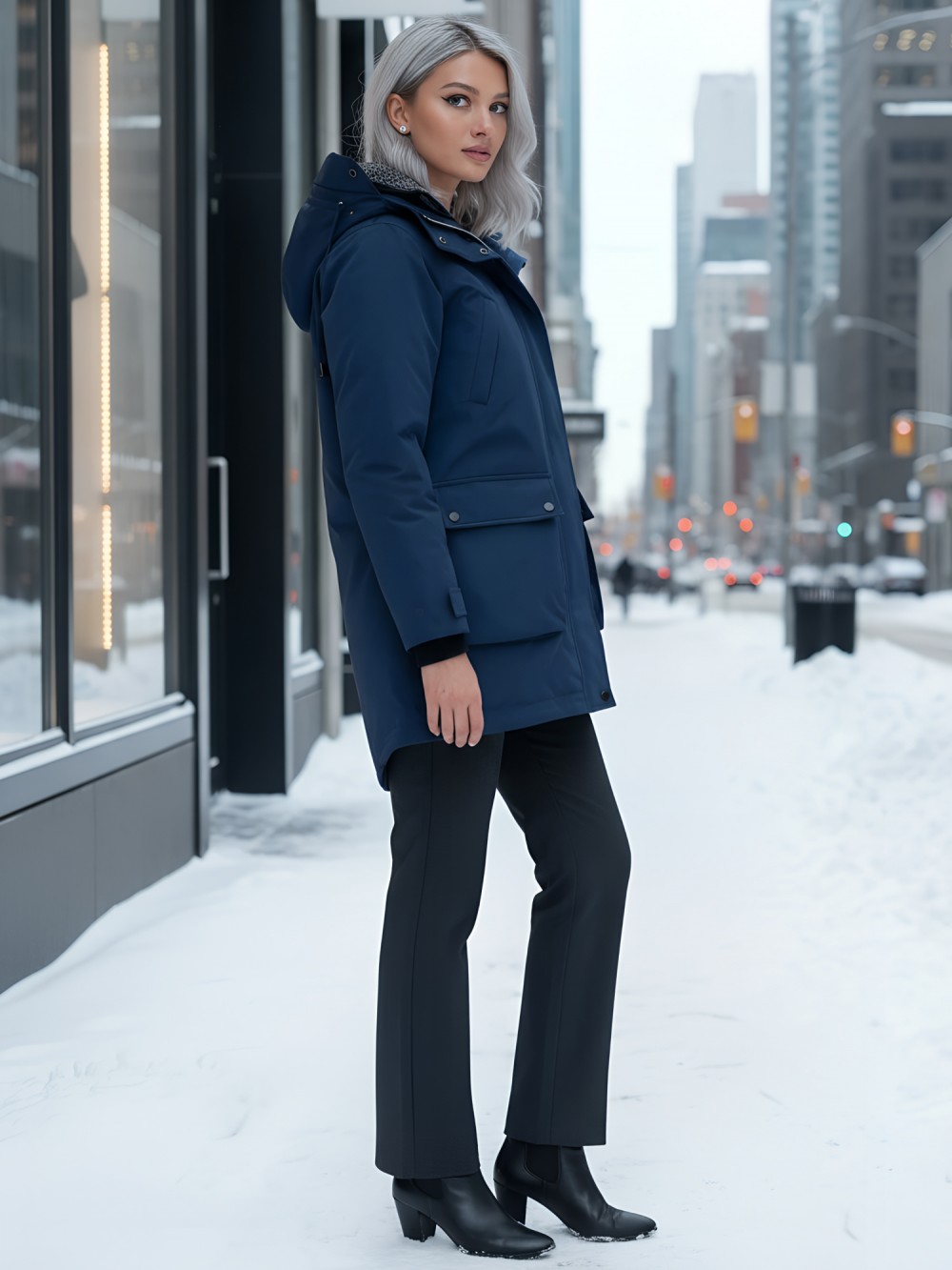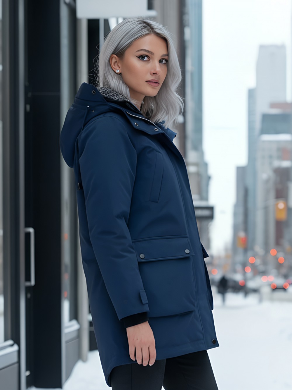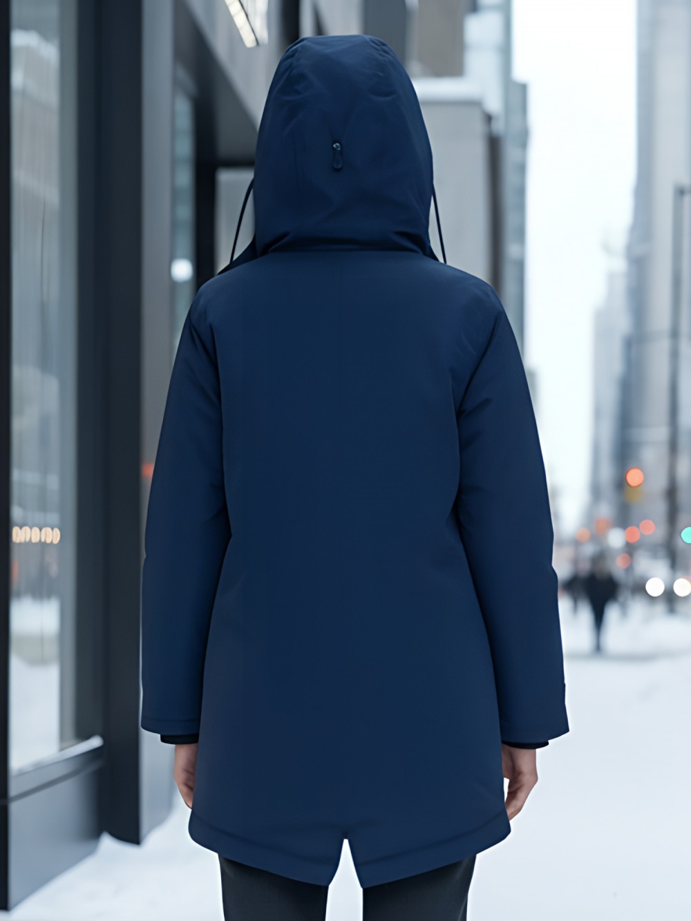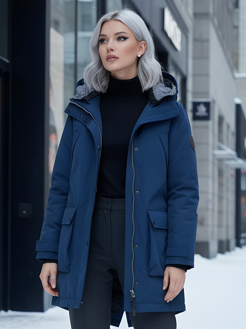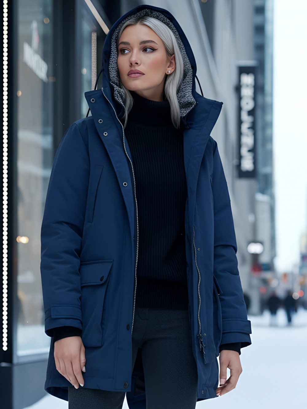 Съемный ветрозащитный капюшон. Парка женская зимняя MTFORCE c капюшоном синего цвета 2329S заказите оптом на mtforce.ru