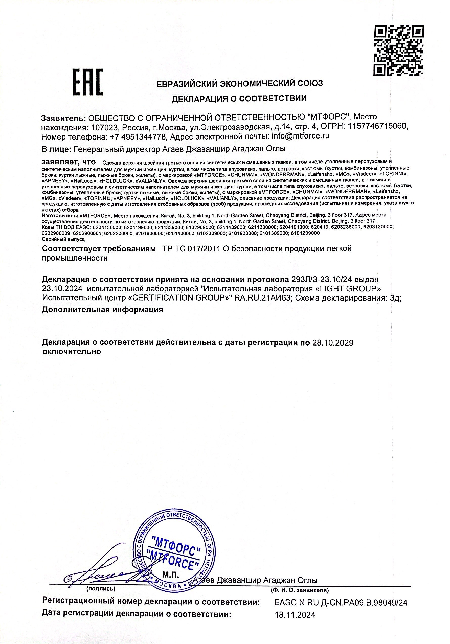 Вся продукция, представленная на сайте mtforce.ru, сертифицирована и соответствует требованиям Таможенного союза. В этом разделе вы найдете полный пакет документов, подтверждающих подлинность и качество нашей одежды.